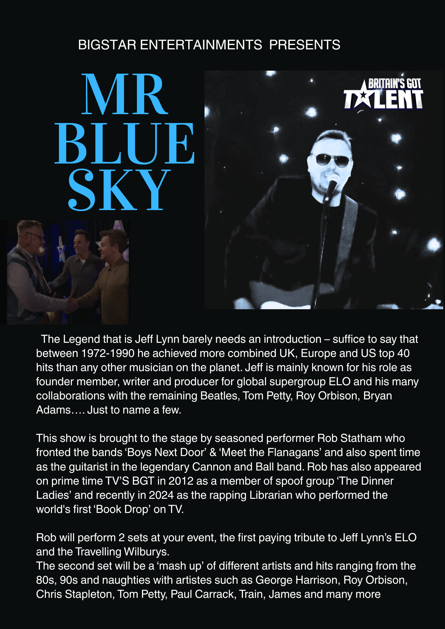 Rob will perform 2 sets at your event, the first paying tribute to Jeff Lynn’s ELO and the Travelling Wilburys.